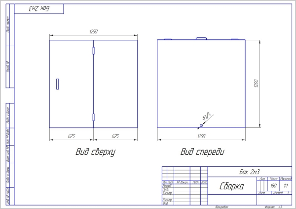 Размер емкости 1250 х 1250 х 1250 мм в метрах 1.25 х 1.25 х 1.25 м. Крышка имеет размер 625 х 1250 мм. Металл стальной г/к 2мм ст3сп5. Толщина металла при заказе может быть любой другой.